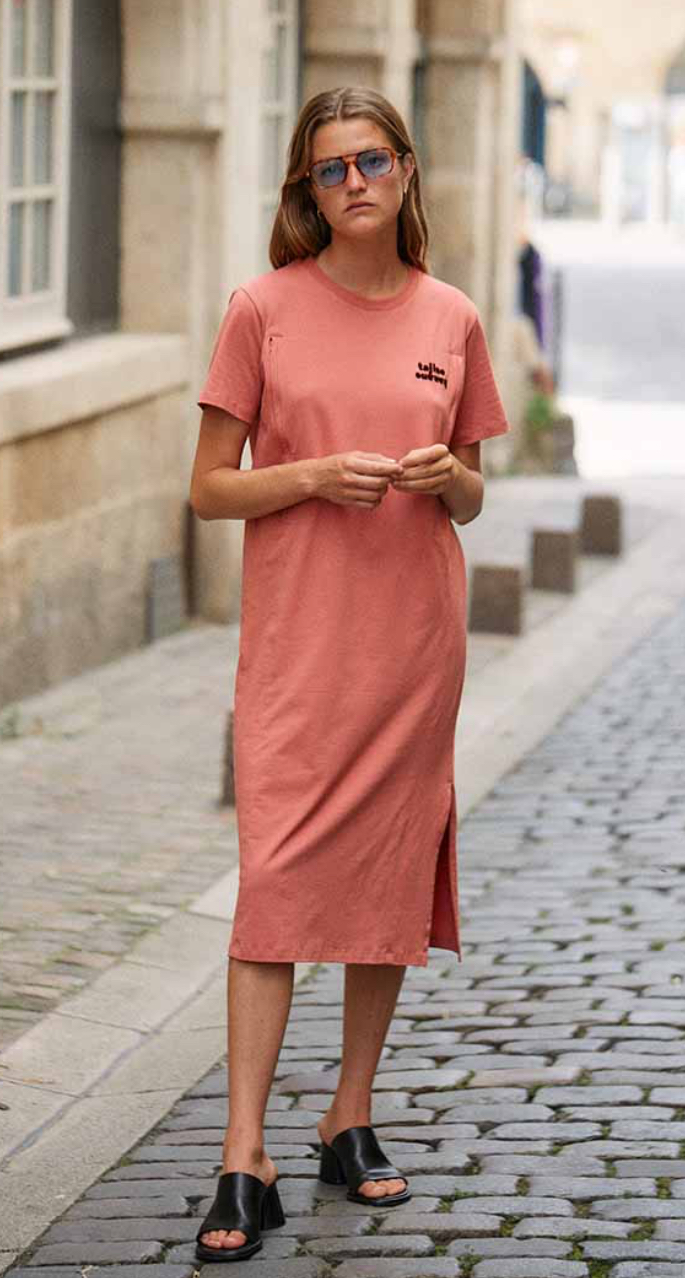השמלה בגזרת טי- שירט משוחררת וזורמת.