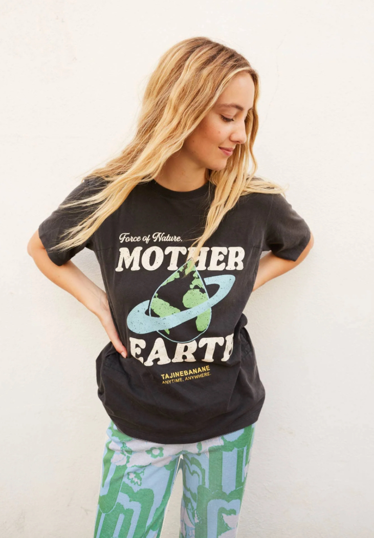חולצה בעיצוב וינטאג׳ על זמני, מזכיר את חולצות הלהקות של ac-dc.